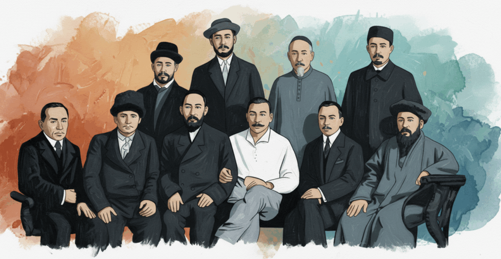 Бұл картинада ХХ ғасырдың басындағы қазақтың ұлт тәуелсіздігі жолында күрескен Алаш қозғалысының қайраткерлері заман стиліне сай топтық портрет ретінде бейнеленген. Сурет тарихи деректерге сүйене отырып жасанды зерде (ИИ) технологиясы арқылы сандық тәсілде модельденген.