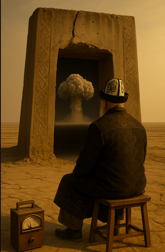 Саңырауқұлақ бұлты: Порталдың ішінде, қараңғы фонда, атом бомбасының саңырауқұлақ бұлтына ұқсас түтін немесе бұлт көрінеді. Бұл элемент күшті символдық мағынаға ие — қырғыз тарихында болған ядролық сынақтардың әсерін, соғыс қаупін немесе адамзаттың жасаған қателігін білдіруі мүмкін.