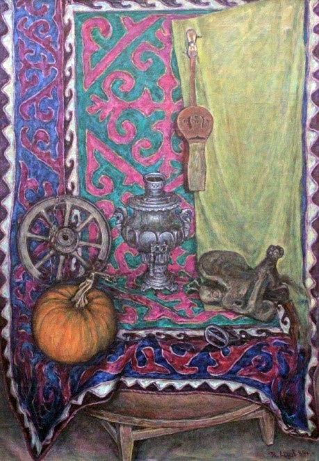 Туынды тік форматты полотноның бәсеңдетілген түстерде орындалған. Сырмақ көрінісінде жартылай жабылған дөңгелек үстелден айналмалы композициядағы заттарды көруге болады. Сол жақта үлкен, сары, пысқан асқабақ бейнеленген. Оның артында темір шығыршықпен зерленген арбаның ағашпен істелген дөңгелегі тұр. тұрады ағаш колесо телеги, обшитое темір сақинамен. Кең дөңгелектің белағашы темір қадамен бекітілген. Дөңгелекте шынжыр ілулі тұр. Композицияның ортасында мыс самауыр. Сырмақтың оң жағында жасыл түсті перда ілінген, ал онда қазақ ұлттық аспабы – прима қобыз. Онда ұзын қоңыр ою-өрнектер бейнеленген. Ұзартылған төменгі бөлігі терімен жапсырылған. Киіз сырмақ ою-өрнекпен безендірілген. Сырмақтың орталық бөлігінде ою-өрнектер көрінеді – қошқар мүйіз, сынық мүйіз. Біріншісі қарама-қарсы жаққа бағытталған екі бұраманы білдіреді. Осындай төрт ірі элемент, бір-бірімен сырмақтың негізгі бөлігіне қосылған. Жарқын қарама-қарсы дақты қызыл түсті элементтер кілемнің жасыл көрінісінен көрінеді. Осындай элементтерімен сырмақтың кең шеттері безендірілген. Ақ түспен екі элемент бөлінген негізгісі және шеттері: су, амулет. Сырмақ шеттерінің жоғарғы бөлігі жақтауға кетеді. Үстелде жатқан перделер шетінде жабдықтарсыз негізгі ер-тоқым тұр. Орталықта сырмақтың шетінде ер-тоқымның үзеңгісі жатыр. Сырмақтың төменгі бөлігінде қоңыр үстелдің шеті, араларында кермелері бар екі аяқ бейнеленген. Оң жақ төменгі бұрышында жазу бар: Т. Абуов 88г.